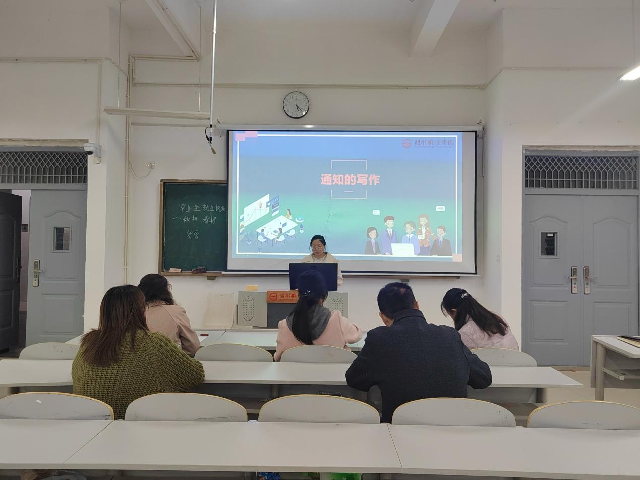 本次集体备课活动采取分组研讨、协同推进的模式,围绕应用文写作与高等数学两门课程的教学重点与育人路径展开深入交流。在应用文写作课程组研讨中,曹淼老师以《信息科关于增设图书馆自习室的请示》为典型案例,进行了教学课件展示与教学设计说明。她通过同一情境在不同教学环节中的递进式运用,引导学生在真实公文写作场景中掌握“请示”文种的格式规范与写作要领,充分体现了案例教学的连贯性与实效性。王莹老师则系统梳理了“请示”文种的知识体系,从结构安排、语言要求到常见误区进行了条理清晰的讲解,强化了教学内容的系统性与逻辑性。