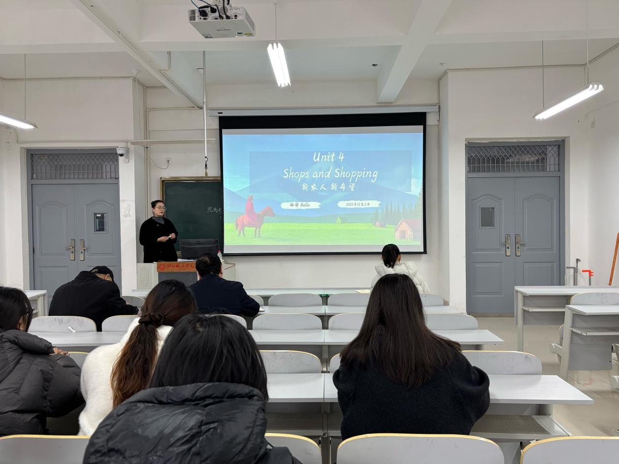 2025年12月2日上午,通识教育学院英语教研室在希文楼203教室举行本学期第四次集体教研活动。本次活动由杨静老师主讲,围绕大学英语第四单元“Shops and Shopping”的教学内容,以“新农人 新希望”为主题,深入探讨如何将课程思政与语言教学有机融合,提升学生综合素养与时代认知。