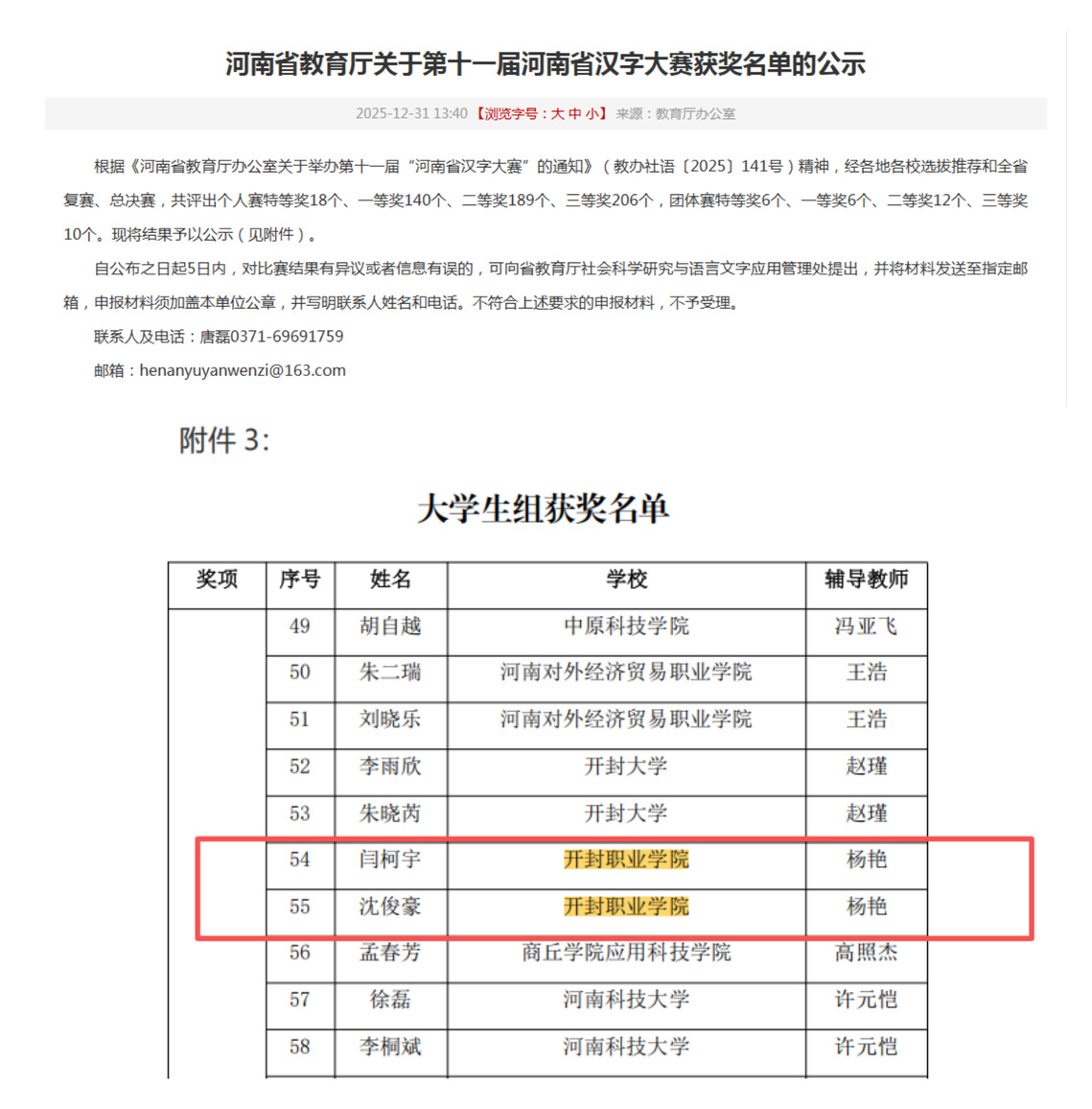 2025年11月30日,第十一届河南省汉字大赛在信阳圆满落幕,2025年12月31日,河南省教育厅公布获奖名单,我校大数据与会计2403班闫柯宇和计算机应用技术2402班沈俊豪两名学子凭借扎实的汉字功底和深厚的文化素养,在众多参赛者中脱颖而出,斩获佳绩。