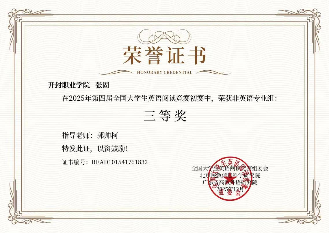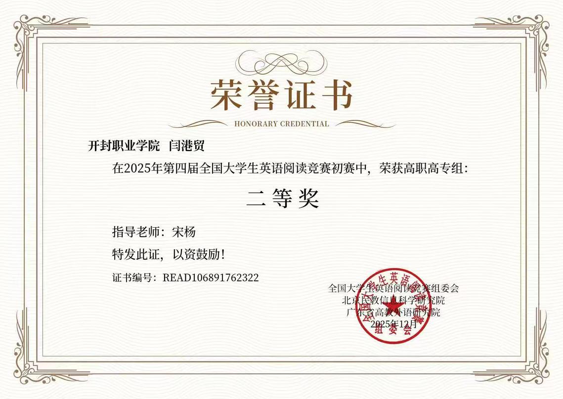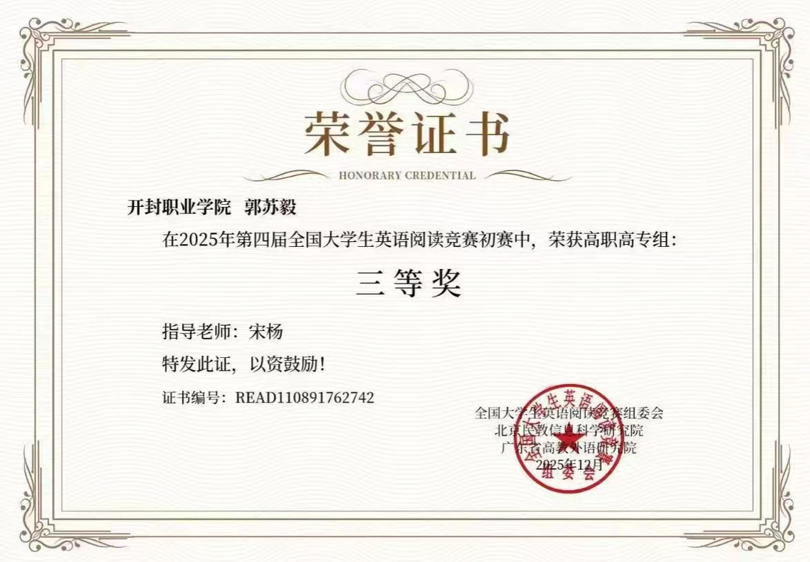 近日,第四届全国大学生英语阅读竞赛初赛获奖名单揭晓,我校学子在专科生组中表现突出,斩获多项荣誉。其中,计算机应用技术2403班薛普乐荣获一等奖;电气自动化技术2502班闫港贸荣获二等奖;人工智能技术应用2501班张固、工业自动化仪表技术2502班郭苏毅、工业自动化仪表技术2502班葛恒宇三位同荣获三等奖,展现了我校学生扎实的英语功底和卓越的阅读能力。