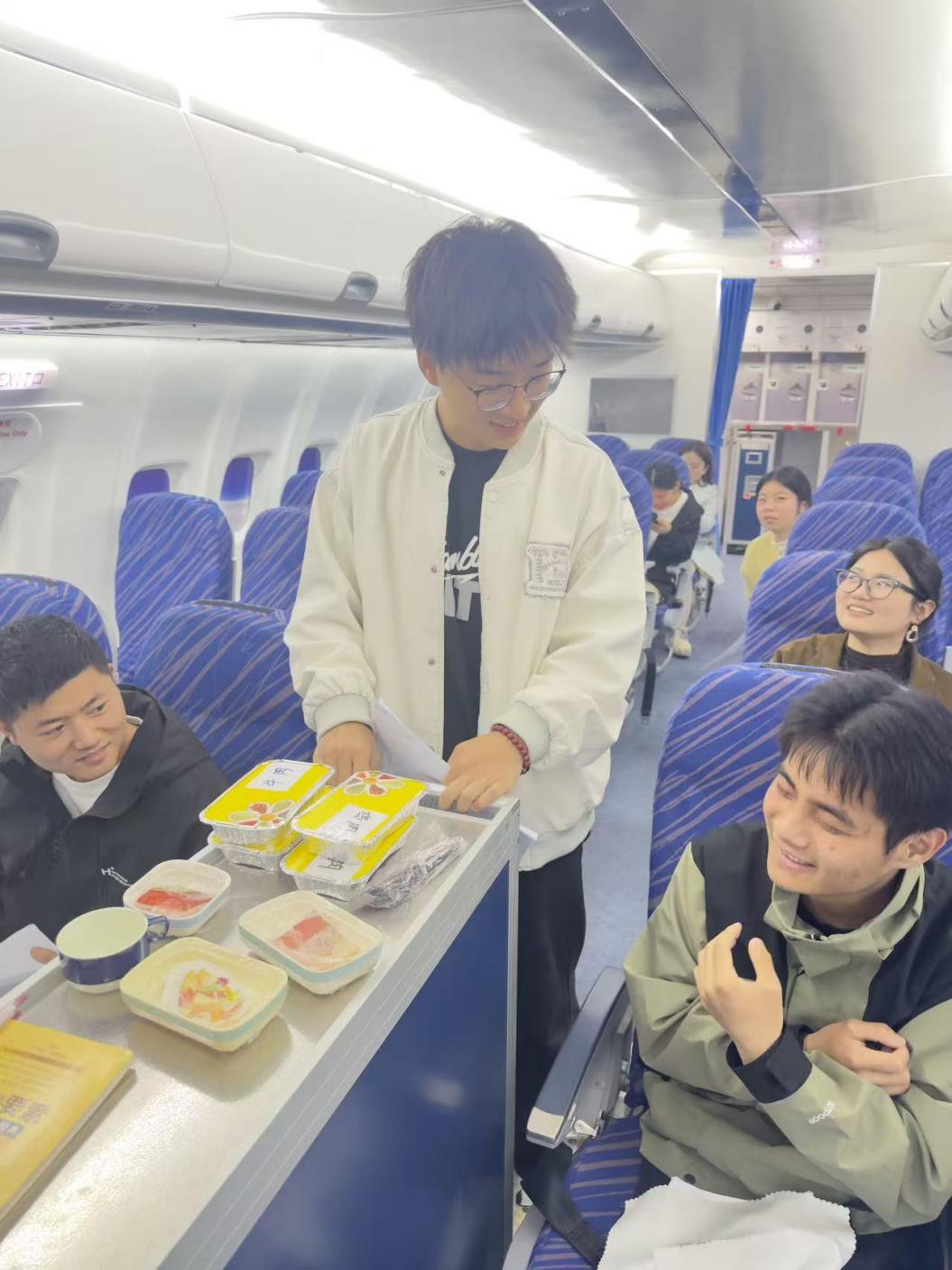 在实景模拟环节,同学们化身乘务员与旅客,在全真模拟舱内分角色开展情景演练。大家灵活运用所学句式,完成登机引导、饮品服务、安全提示、降落告知等完整服务流程,在真实场景中开口说、大胆练,切实提升英语沟通的流畅度与自信心。老师们全程巡回指导,针对语气、用词、仪态等细节逐一点评,让学习更具针对性与实效性。