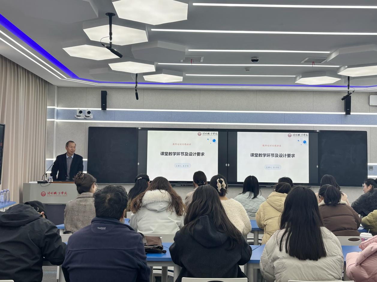 为进一步提升教师教学能力,优化课堂教学质量,3月10日下午,通识教育学院在毕昇楼212教室举办专题讲座,特邀教务处督导室焦子国教授主讲《课堂教学环节及设计要求》。通识教育学院院长张清芳出席,学院全体教师参加本次培训。焦教授从教学模式的发展脉络切入,焦子国教授梳理了教学模式的发展脉络,从古代传统教学思想,到近代班级授课制与“五段式”教学确立,再到现代杜威“做中学”理念引领下的多样化教学探索,清晰呈现了教学环节从单一向多元、从传统向现代的演变历程,帮助教师从历史维度深化对教学环节的认知。课堂教学环节的理论依据层面,焦教授结合认知科学与教育心理学展开深度解读:一是遵循认知规律,契合学习科学,引入“峰