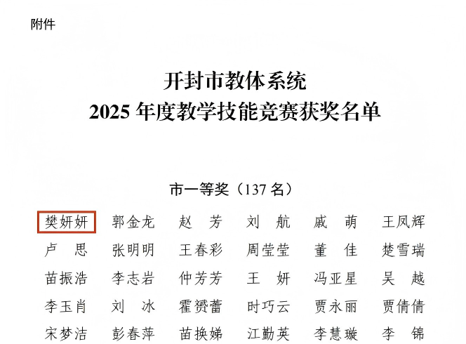 近日,开封市总工会、开封市教育体育局联合下发《关于开封市教体系统2025年度教学技能竞赛获奖情况的通报》(汴总发〔2025〕28号),公布了本年度教学技能竞赛的获奖名单。通识教育学院樊妍妍老师在竞赛中表现优异,荣获市级一等奖。本次教学技能竞赛由开封市总工会、开封市教育体育局共同主办,围绕“上好一门课”的核心理念展开,旨在全面提升教师的教学能力和专业素养,推动教体系统高素质教师队伍建设。自赛事启动以来,通识教育学院高度重视,将其作为促进教师成长、深化课堂改革、提升教学质量的重要平台,积极组织教师备赛,营造出“以赛促教、以赛促研、以赛促改”的良好氛围。樊妍妍老师紧密围绕课程目标,有机融合现代教育技